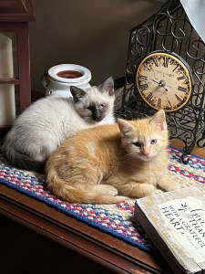 One of our fun journeys has been the addition of our twin kittens; the only 2 in the litter. Meet Spunky, our handsome yellow fellow, and Matilda, Matty for short, our beautiful blue eyed girl.